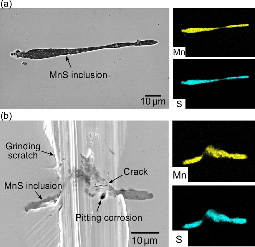 (a) Scanning electron microscopy (SEM) image and elemental maps obtained by energy-dispersive X-ray spectroscopy of MnS inclusions on a smooth stainless steel surface. (b) SEM image and elemental maps of MnS inclusions on a stainless steel surface subjected to rough grinding. The MnS inclusions are deformed by grinding, with cracks and partial embedding into the steel matrix observed. Pitting corrosion is observed at locations where grinding scratches intersect with MnS inclusions. ©Siqi Wang, Masashi Nishimoto, Izumi Muto.