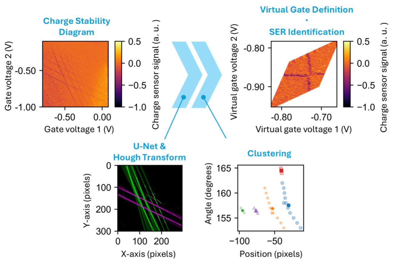 Overview of the proposed method. The charge stability diagram obtained from measurements is input to a U-Net model to automatically extract charge transition lines. The extracted lines are then processed using the Hough transform for straight-line detection, followed by clustering. Finally, the single-electron regime is visualized in the virtual gate space. ©Yui Muto et al