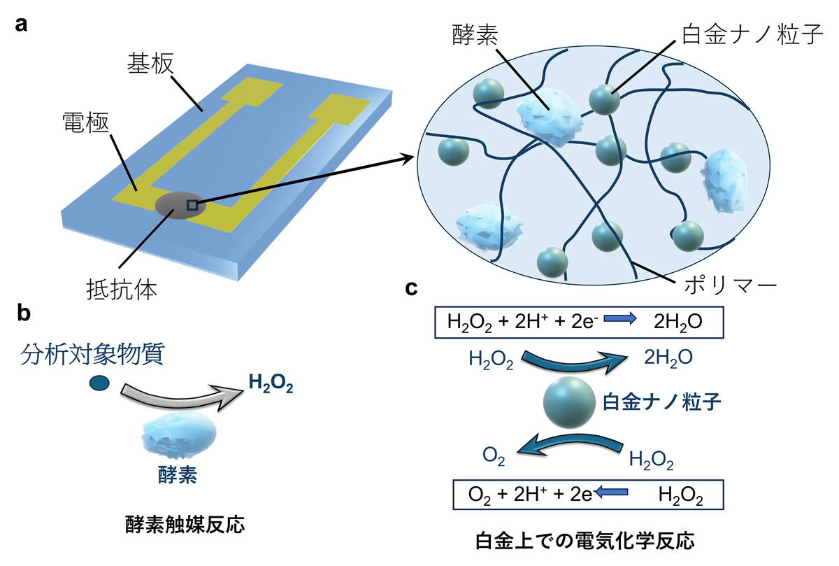 図1. 開発した抵抗型バイオセンサの概要と動作原理。a. センサ構造の模式図。金属電極間に化学抵抗体が形成されており、複数の酵素および白金ナノ粒子が高分子マトリクス中に担持された構造を有する。b. 分析対象物質であるクレアチニンが酵素によるカスケード反応を受け、過酸化水素(H₂O₂)が生成される。c. 生成したH₂O₂が白金ナノ粒子表面で酸化・還元反応を起こし、電荷移動および伝導経路の変化を通じて化学抵抗体の電気抵抗が変化する。