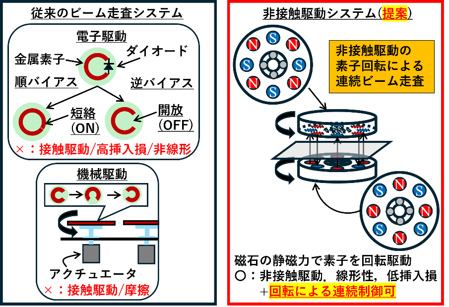 一方で、これまでに提案されてきた多くのパターンリコンフィギャラブルアンテナでは、ダイオードやモーターなどの可変機構をアンテナに機械的に接続する必要がありました。この方法では、可変機構をアンテナへ機械的に接続させるための構造や加工が複雑になるだけでなく、可変機構の部品や配線が電磁波を吸収・散乱させることで、高周波特性が劣化しやすくなるという課題があり、実用化に向けた大きな障壁となっていました(図1)。