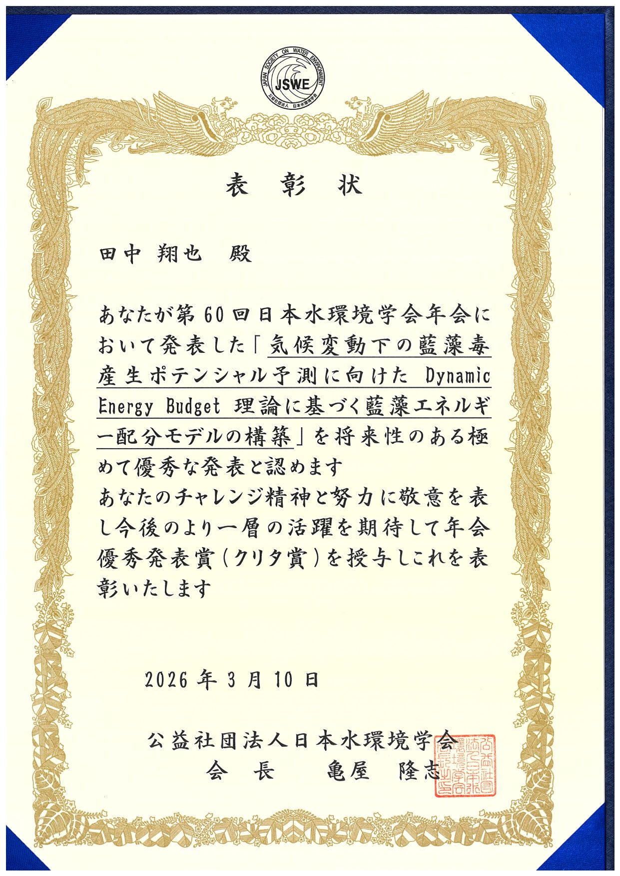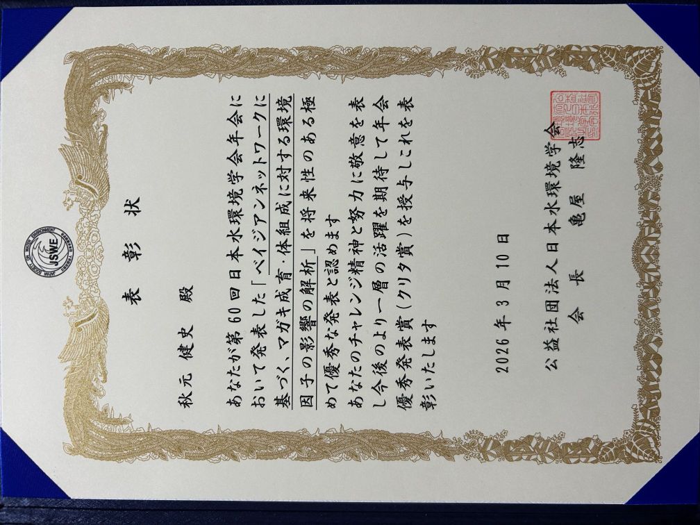 秋元健史さん、齋藤輝さん、および田中翔也さん(共に土木工学専攻・博士前期課程2年)が第60回日本水環境学会年会(2025年度)・年会優秀発表賞(クリタ賞)を受賞