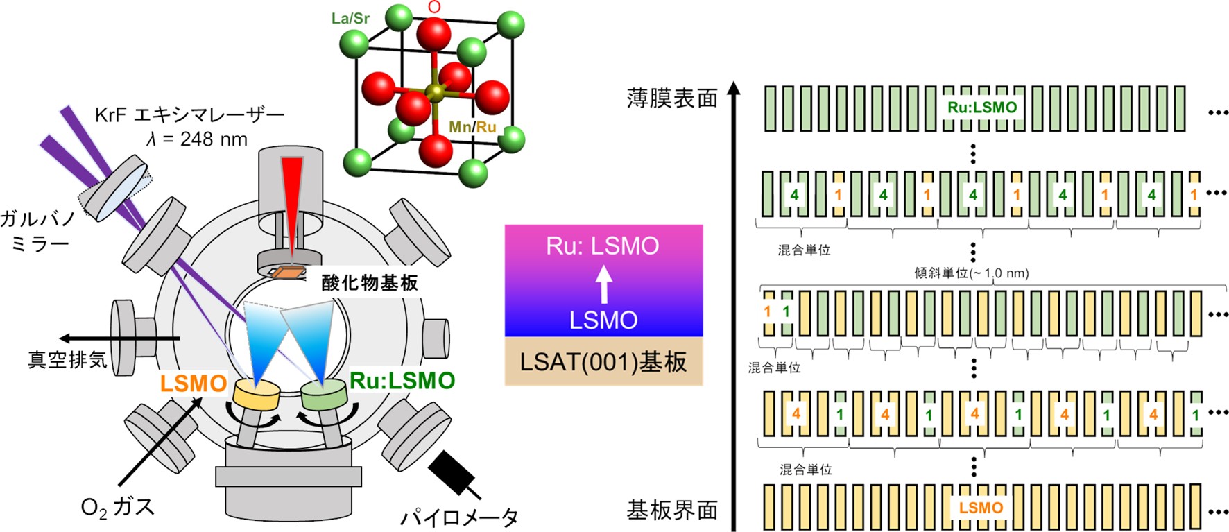 (左)本研究で用いた「ガルバノミラー走査型パルスレーザー堆積装置」の概念図。ミラーを高速制御することで、2種類の材料(LSMOとRu:LSMO)を瞬時に切り替えながら成膜する。(左上)本研究で用いたペロブスカイト型マンガン酸化物(LSMO)の結晶構造。(右)ナノ傾斜薄膜の構造模式図。基板界面から膜表面に向かって、ルテニウムを含む層と含まない層の積層比率を連続的に変えることで、ナノメートルスケールの滑らかな線形濃度勾配を実現した。これにより、自然界には存在しない磁気的状態を人工的に作り出すことが可能になる。