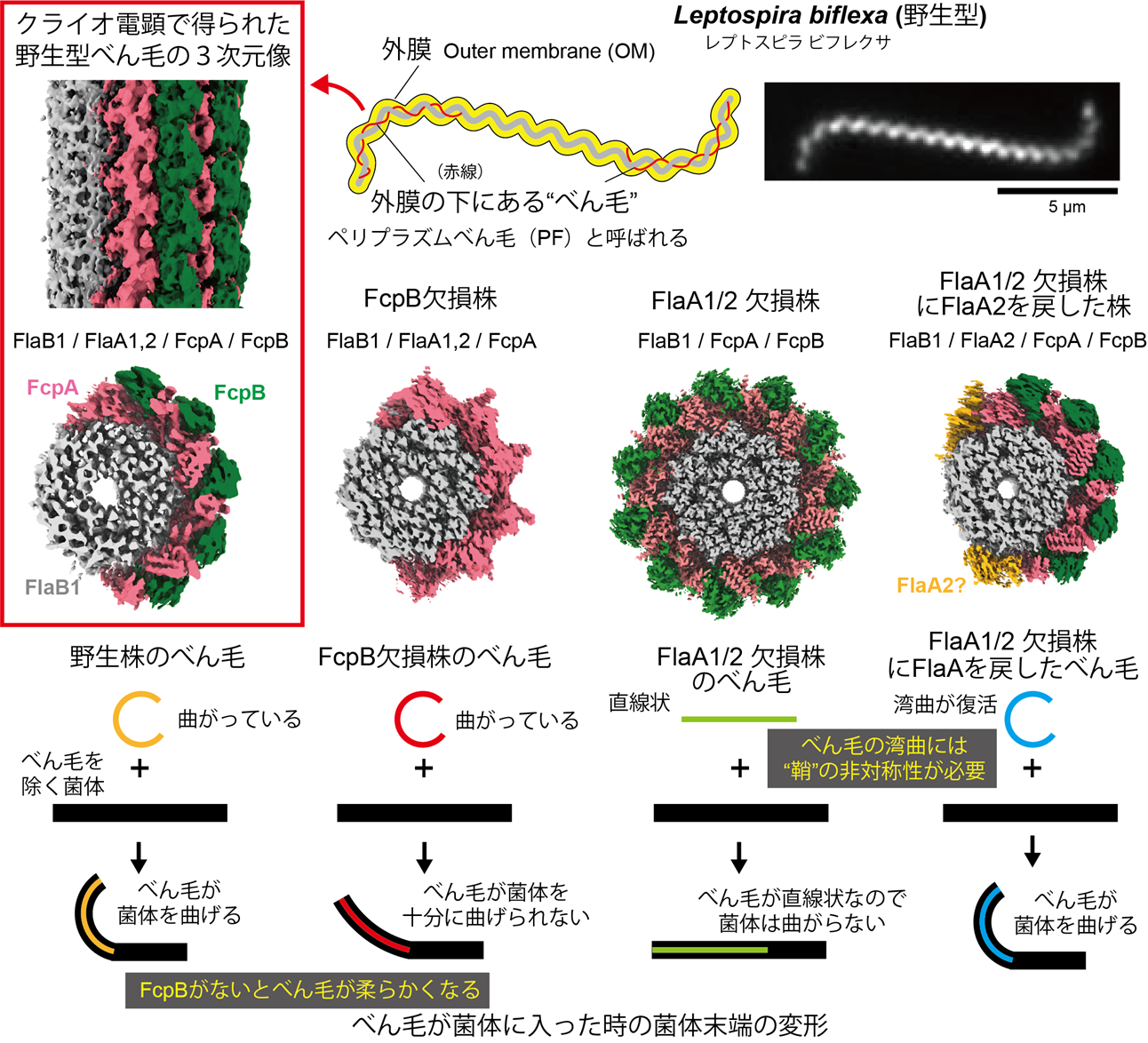 - 本研究では、レプトスピラのべん毛が非対称に配置された鞘構造によって、適切な「湾曲」と「剛性」を獲得し、細胞形状の形成と力強いコルク抜きのような回転運動を両立させる仕組みを明らかにしました。