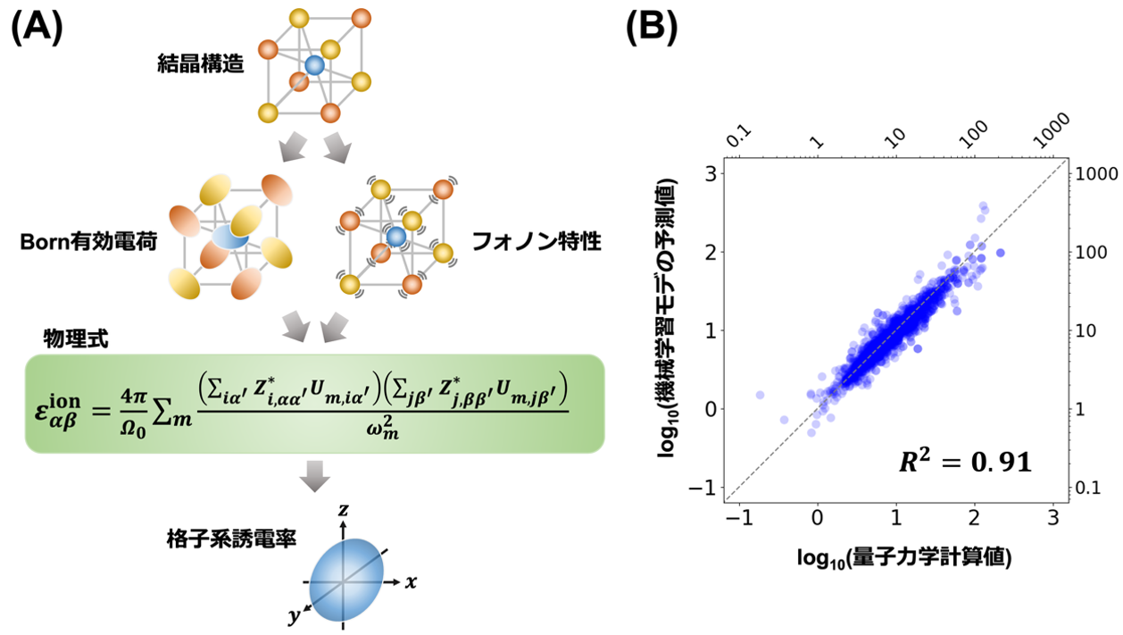 図1. (A)本研究において構築した機械学習を用いた予測手法の概略図。結晶構造の情報からBorn有効電荷とフォノン特性を個別の機械学習モデルで予測し、図に示す物理式を用いて誘電率のイオン寄与を再構築します。(B)928酸化物中のイオン寄与予測値で、横軸は量子力学計算による値を、縦軸は機械学習による予測値を示しています。R2は決定係数という予測精度を表す指標で、1に近いほど予測精度が高いことを示します。