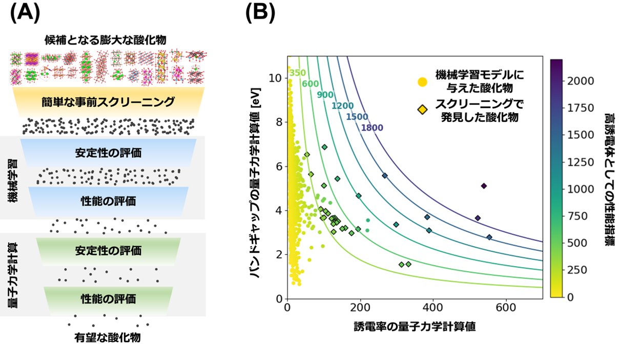 図2. (A)本研究における高誘電酸化物探索の概略図。(B)選抜した31種の酸化物について、横軸を量子力学計算により得られた誘電率とバンドギャップ、縦軸をバンドギャップの量子力学計算値としてプロットしたものを♢で示しています。色は、高誘電体の性能指標で、バンドギャップと誘電率の積で表現され、この値が高いほど有望な高誘電酸化物であることを示唆しています。参考として、本研究で機械学習モデルを訓練するために与えた酸化物を○で示しています。