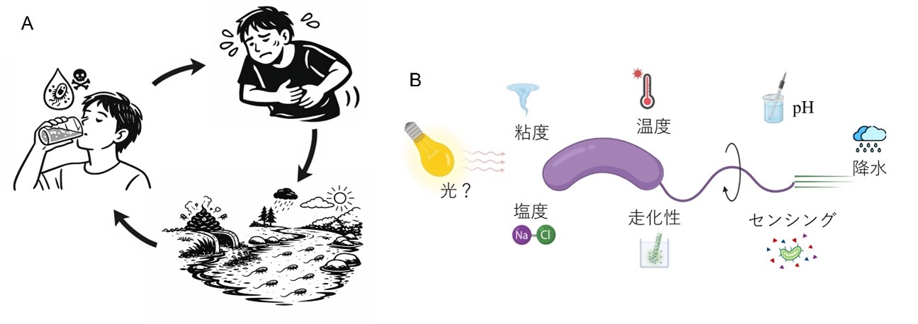B:コレラ菌の環境センシングと運動性。コレラ菌は一本の極べん毛を用いて遊泳し、粘度、温度、pH、塩濃度、降水など様々な環境要因を感知しながら行動を調節する。本研究では、これらの要因に加えて光がコレラ菌の運動制御に影響する可能性に着目した。