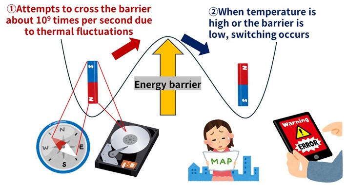 この磁化方向を保つ性質は、ハードディスクなどの磁気ストレージや磁気抵抗ランダムアクセスメモリー(MRAM)などの磁気メモリーにて利用されています。「丘」の高さ(エネルギー障壁)は、磁石の体積に比例します。例えばハードディスクでは、一つ一つのビットの体積に比例するため、記録容量が大きくなるにつれてエネルギー障壁が低くなり、熱によって自然に磁化の向きが変わってしまう(磁化反転)ことが原理的には起こり得ます。これは、記録媒体で自発的に情報が失われてしまうことを意味し、情報ストレージとしては致命的です(図1)。実はこうした熱的な磁化方向の反転試行は、1秒間に10億回程度行われていると予想されてきました(図1①)。そして各試行の成功確率は、高温になった場合や「丘」が低くなった場合に指数関数的に上昇します(図1②)。