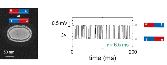 今回、東北大学の金井駿准教授、早川佳祐大学院学生(当時)、Mehrdad Elyasi准教授、Gerrit Bauer教授、深見俊輔教授らの研究チームは、この反転試行時間τ0を直接測定することに取り組みました。研究チームはまず、ナノ磁石素子を作製し、その形状や大きさを走査電子顕微鏡で精密に確認しました(図2左)。また、この素子の電気抵抗を測定することで、室温で熱的な磁化反転を起こしていることを示すランダムテレグラフノイズを計測しました(図2右)。この二値的なゆらぎは、熱により励起された磁化反転に対応しています。