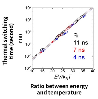 そこで研究チームは、素子体積を変えることでエネルギー障壁のみを系統的に制御できることに着目しました。つまり、温度を変える代わりに素子体積を制御することで磁化反転のしやすさを制御し、エネルギー障壁のみを系統的に変化させる新しい実験手法を考案しました(図3)。この方法を用いることで、温度を変えることなくアレニウスプロットを利用し、長年仮定されてきた反転試行時間τ0を初めて実験的に決定することに成功しました。