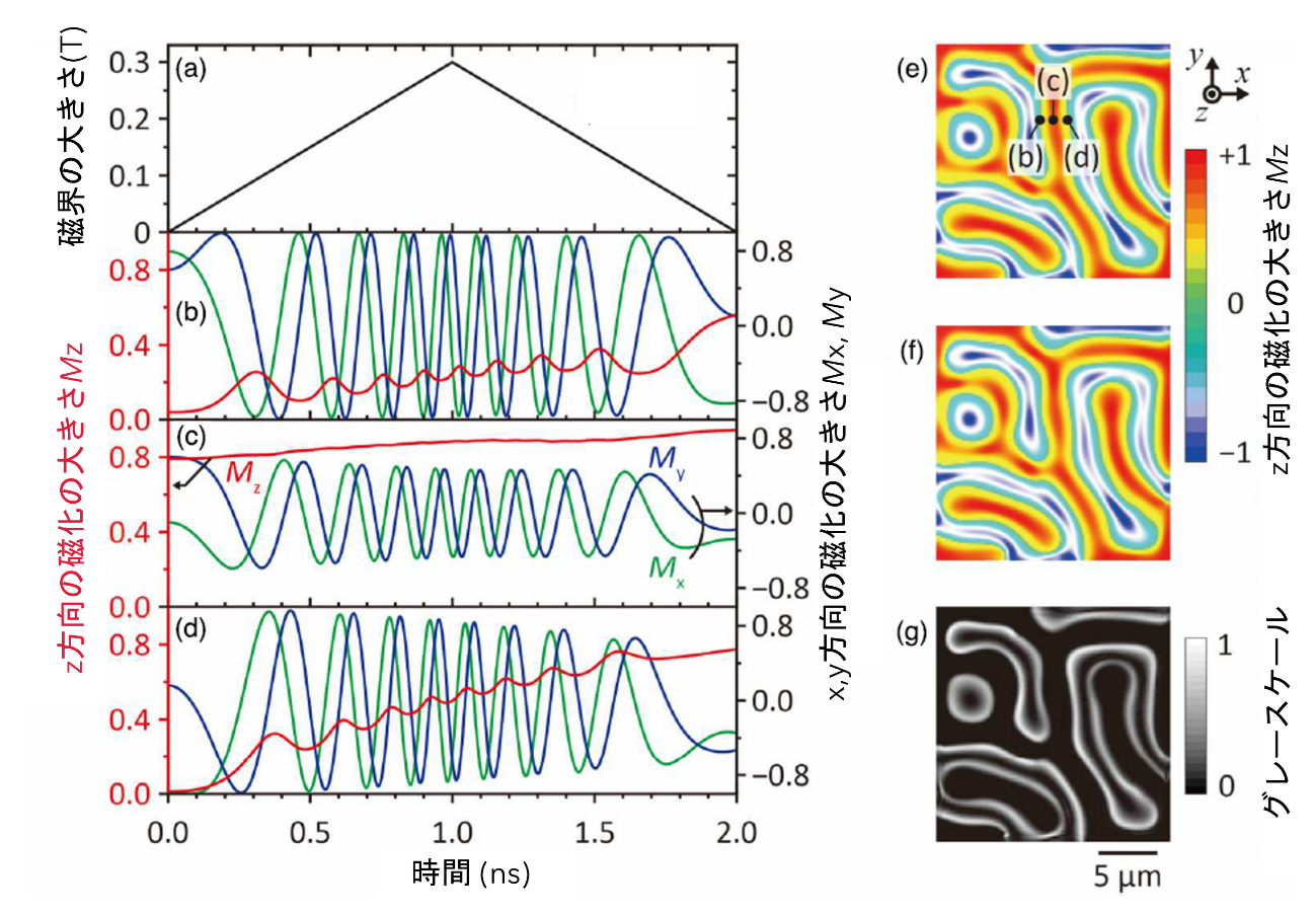 シミュレーションの結果、強い磁場パルスを1回加えるだけで、磁気ドメインが膨張と収縮を繰り返しながら、最大6.5 GHzというギガヘルツ領域の高周波振動が生じることが明らかになりました(図2、図3)。
