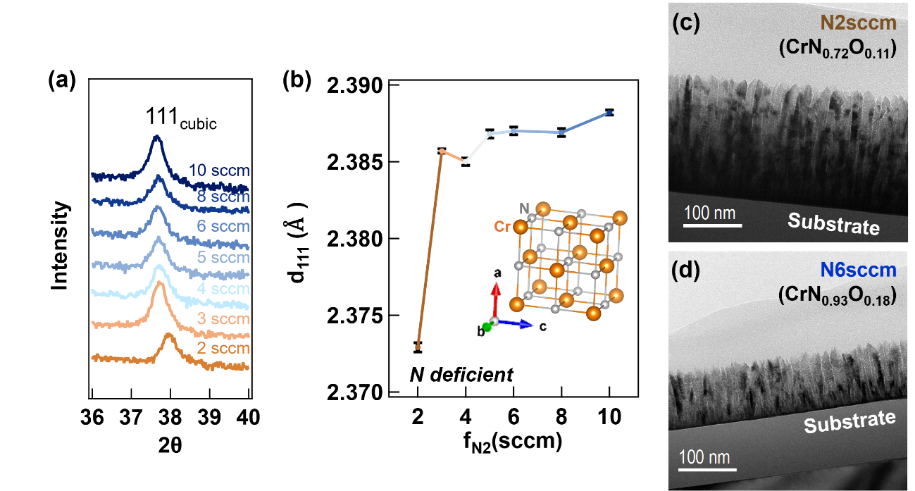 図1. (a) 各fN2で成膜したCrN薄膜のXRDパターン。(b) 各fN2条件におけるCrN薄膜の(111)面の面間隔d111。なお、d111値は、(111)回折ピーク位置から算出した。挿入図にNaCl型CrNの結晶構造模式図を示す。(c) fN2 = 2 sccmで成膜したCrN薄膜の断面TEM像。(d) fN2 = 6 sccmで成膜したCrN薄膜の断面TEM像。
