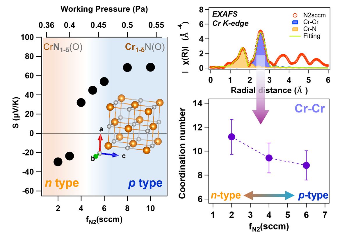 東北大学大学院工学研究科の双逸助教と須藤祐司教授らの研究グループは、スパッタリング装置内の残留酸素を活用し、反応性窒素ガス流量を制御することで、CrN薄膜の伝導型をn型からp型へと変換できることを見出しました。低流量ではN空孔によりn型を示し、流量の増加によりCr空孔が安定化してp型へと変化します。放射光実験および第一原理計算により、酸素が欠陥形成を制御する因子として機能していることを明らかにしました。